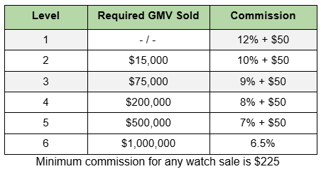 Sellers will be assigned a certain status level based on the gross market value of the watches they have sold through the platform. Once they have hit the thresholds laid out below, they will be eligible for the fee structure at that status level. For example, if someone sells their first watch for $20,000, the fee associated with that sale will be 12% but the fee associated with their next sale will be 10% as they used their first sale to surpass the $15,000 threshold to reach Level 2. Selling fees will be charged when the sale is confirmed.